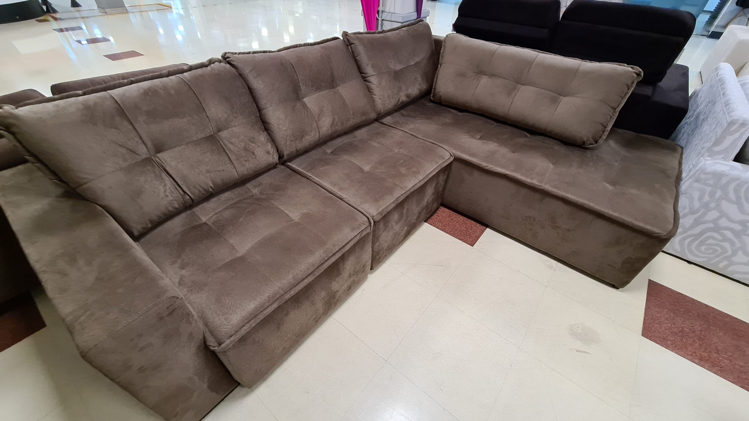 Tecidos em diversos padrões, inclusive importados, com composição afixada em etiqueta que acompanha o estofado